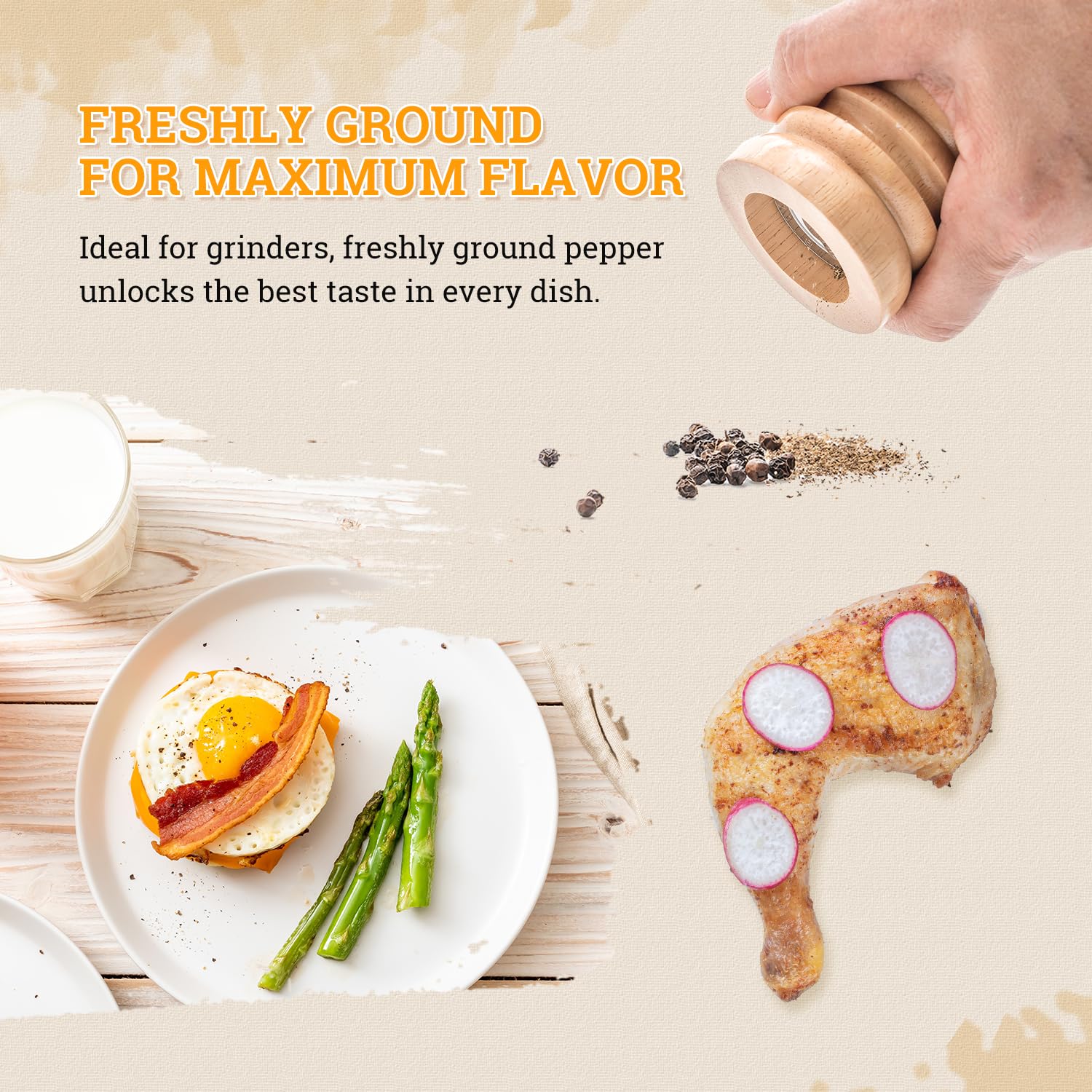 - Whole Black Peppercorns (18oz): Bold, aromatic, and perfect for meats, veggies, soups, and salads.