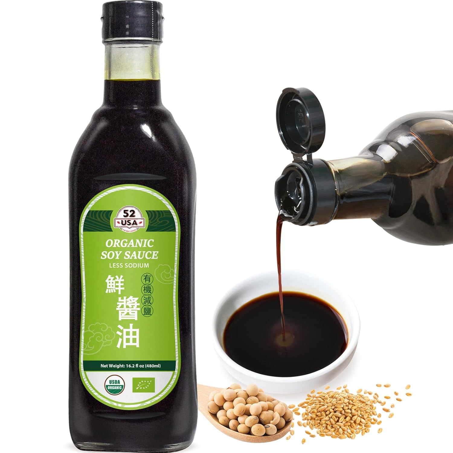 Enjoy rich, savory flavor with less salt. 52USA Organic Low Sodium Soy Sauce is brewed naturally from organic soybeans for a clean, balanced taste. Perfect for stir-fries, marinades, dipping sauces, and everyday cooking.